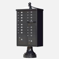 Sitting atop a pedestal base, the CBU-TR-16 offers 16 tenant boxes and 2 parcel boxes. It is adorned with a decorative roof cap with ball finial and is available in Black, Dark Bronze, Tan, and White.